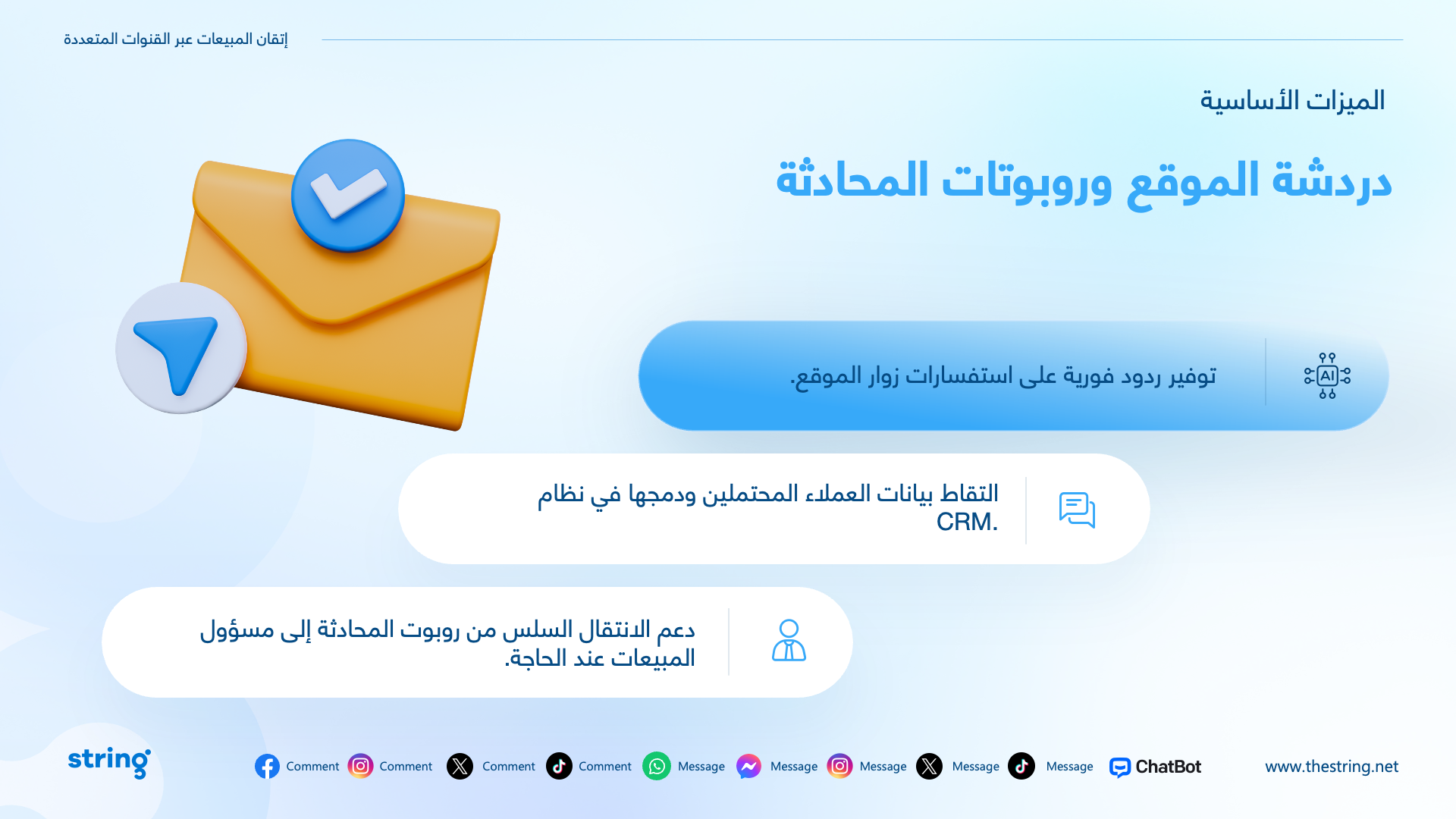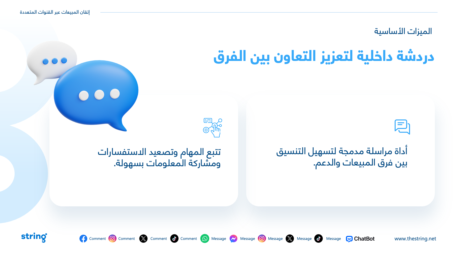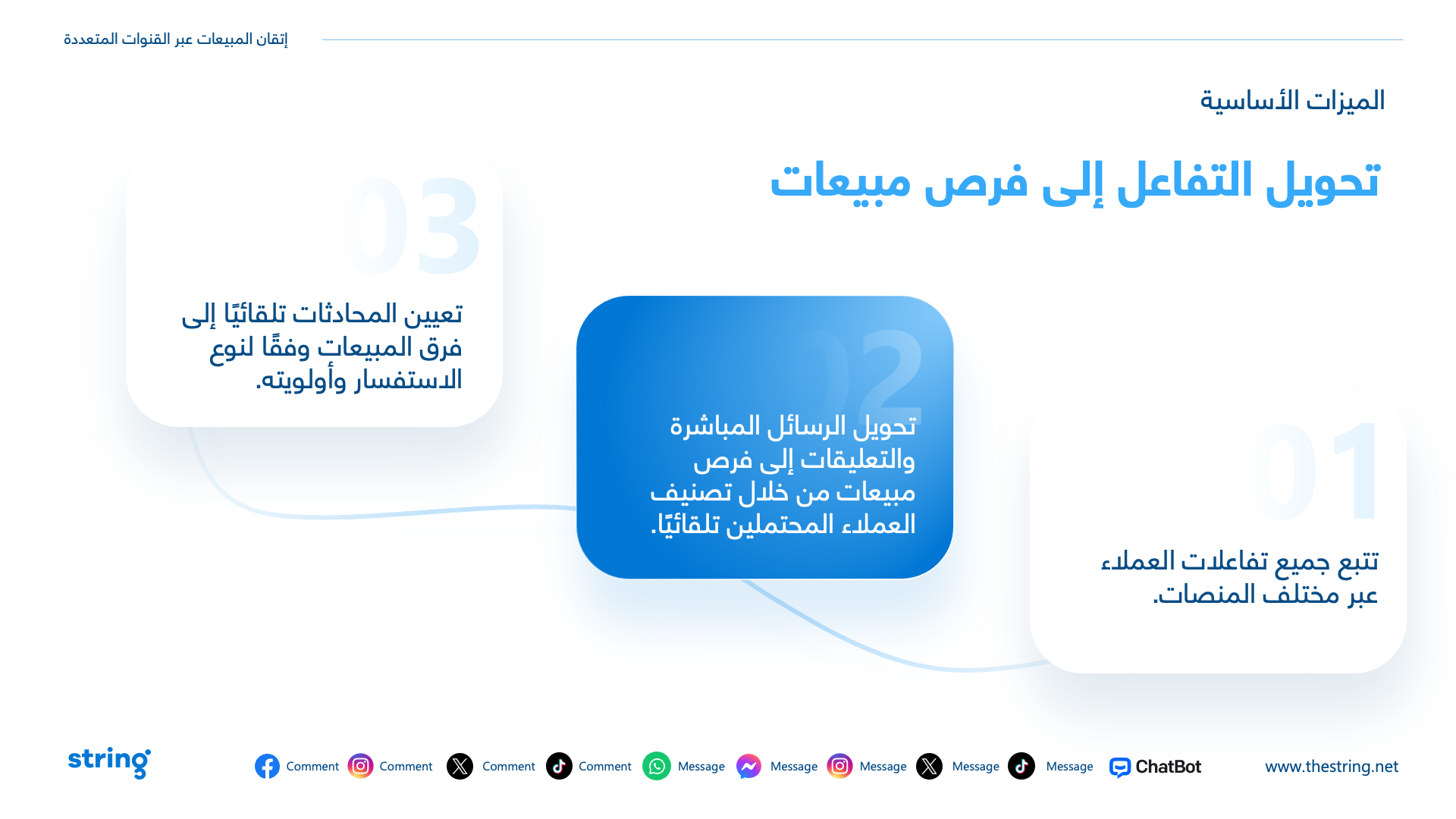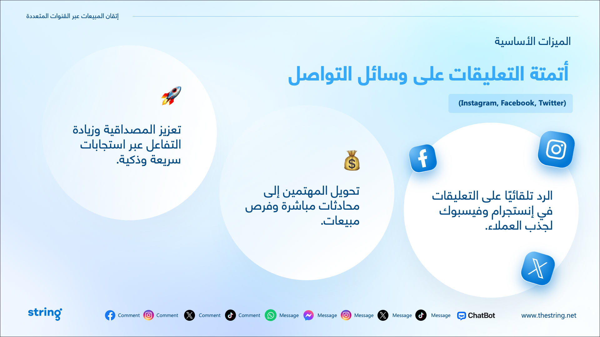 The presentation highlighted how String’s platform turns customer chats into sales, no matter where they happen—email, social, or more. Clean, bilingual slides (English and Arabic) showed how it…