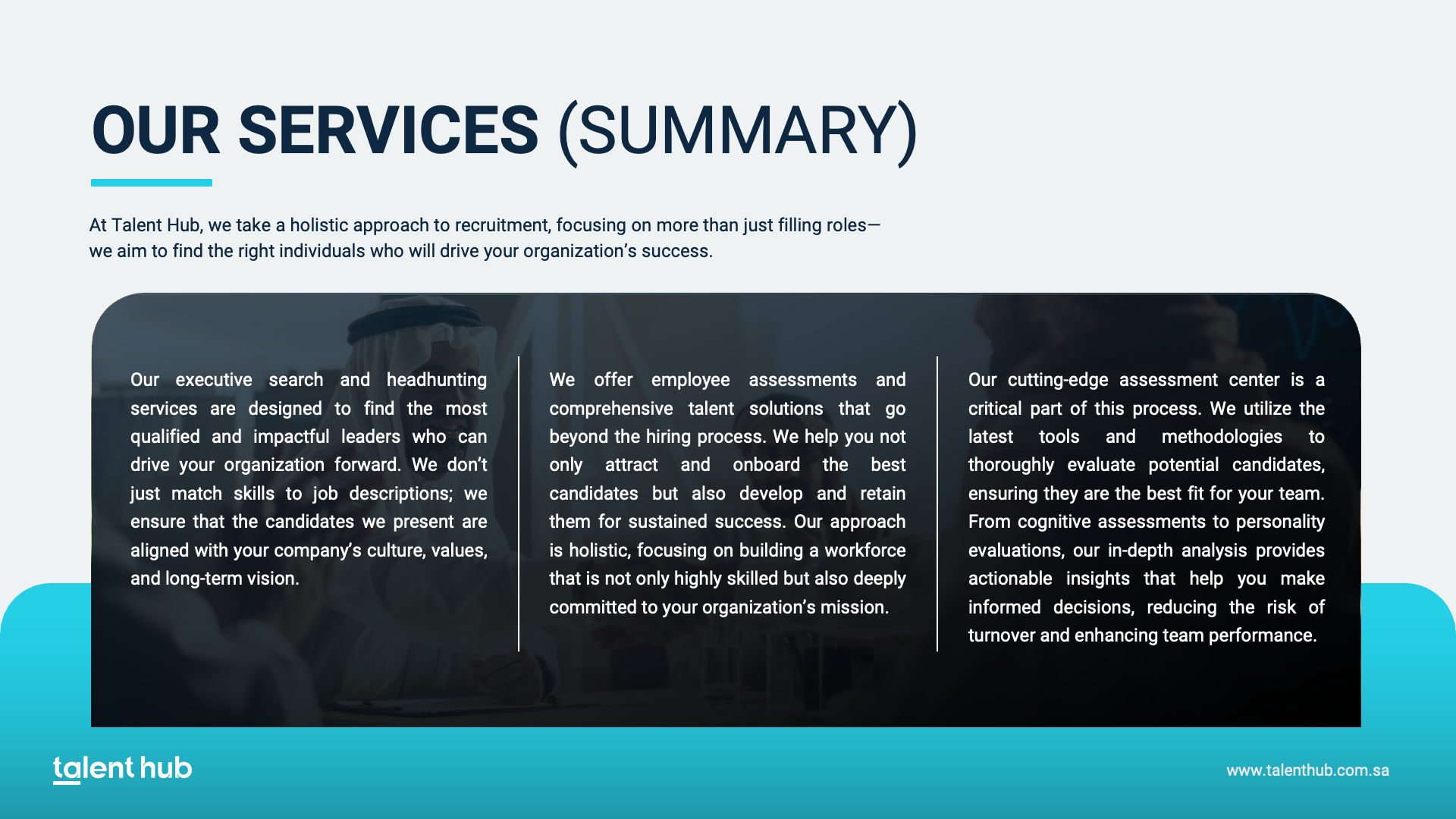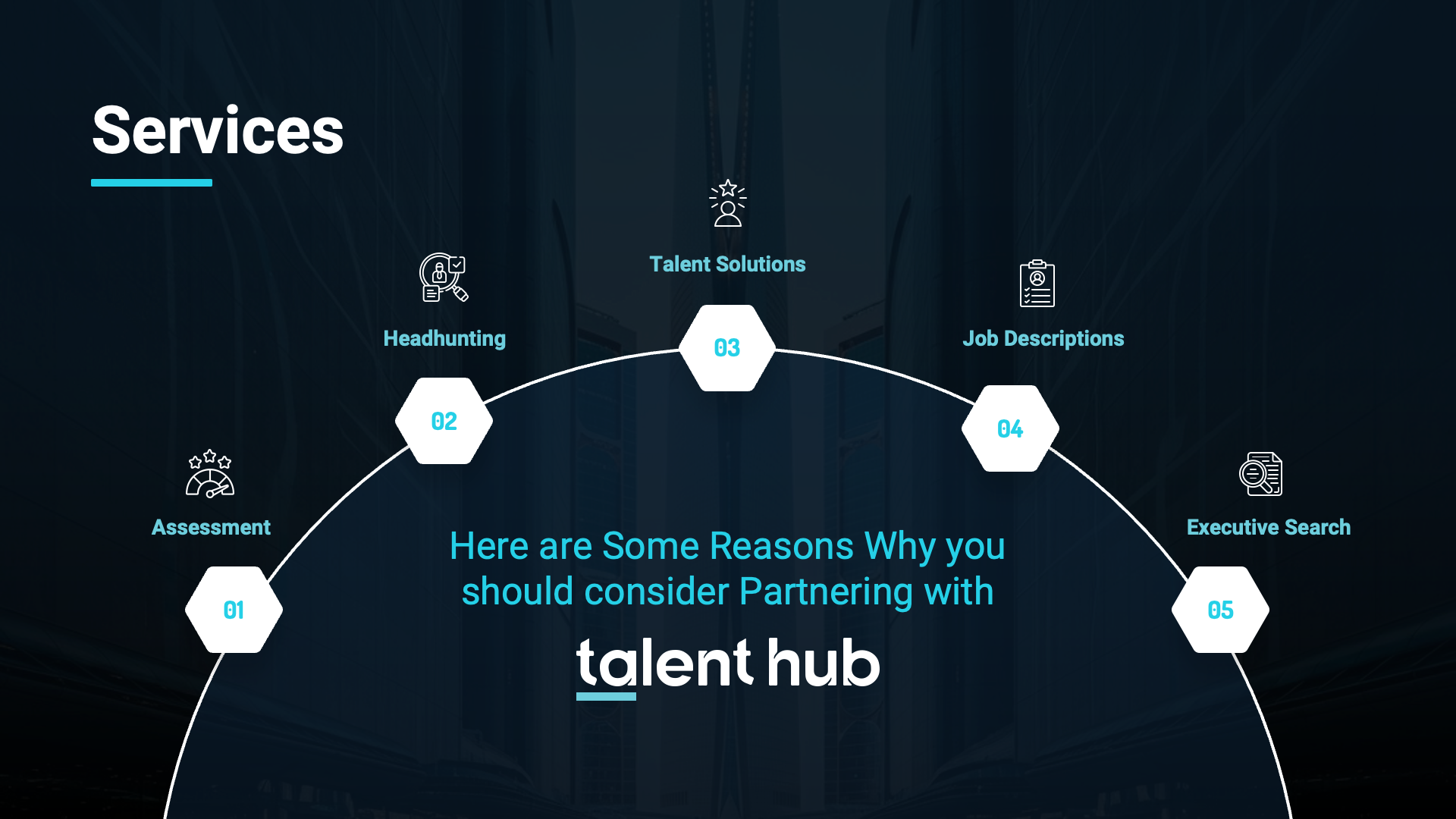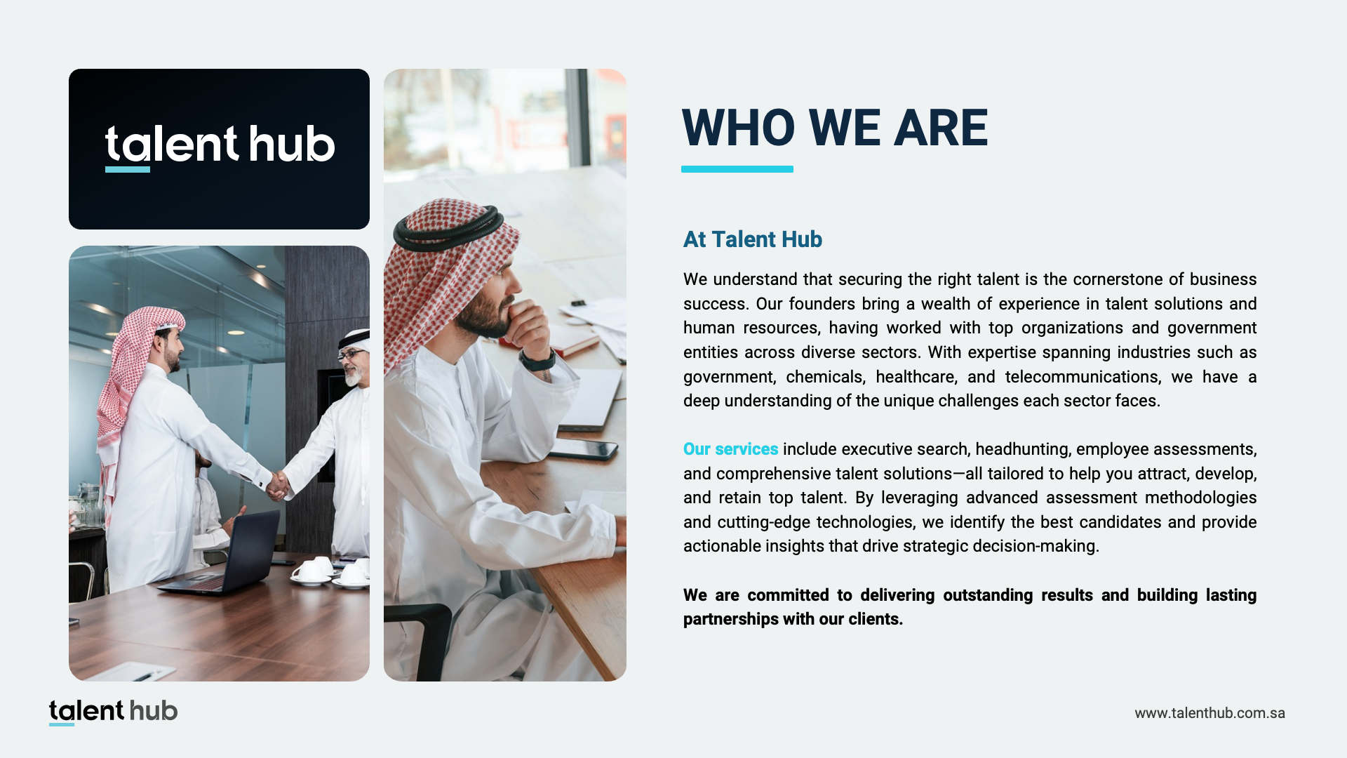 Talent Hub doesn’t just find talent , they build teams that shape the future. For their company profile, we designed a presentation that reflects their precision and passion. Clean, dynamic slides go through the executive search, headhunting, and employee assessment services while trying in some stories about how they've supported other companies in becoming successful. we turned their story into a tool that speaks to businesses looking for more than just a recruiter.
