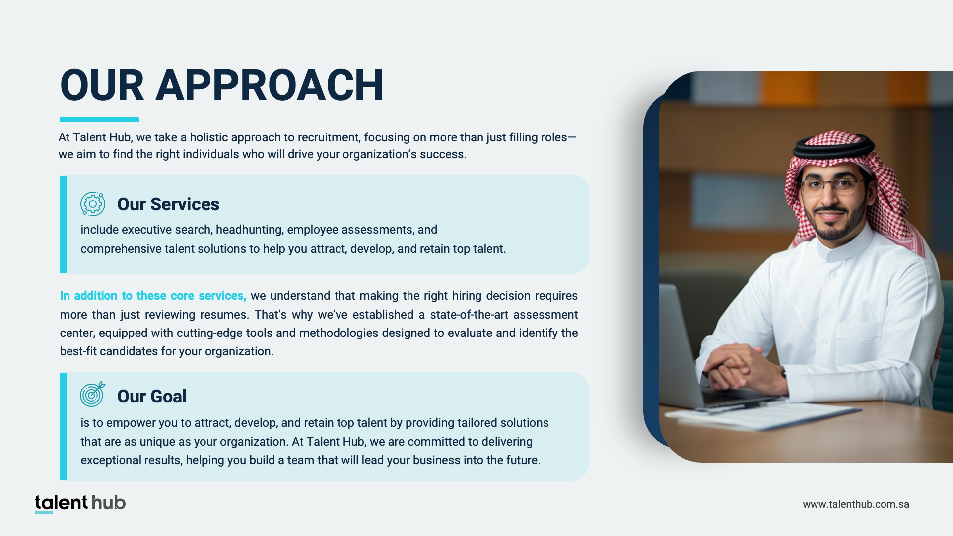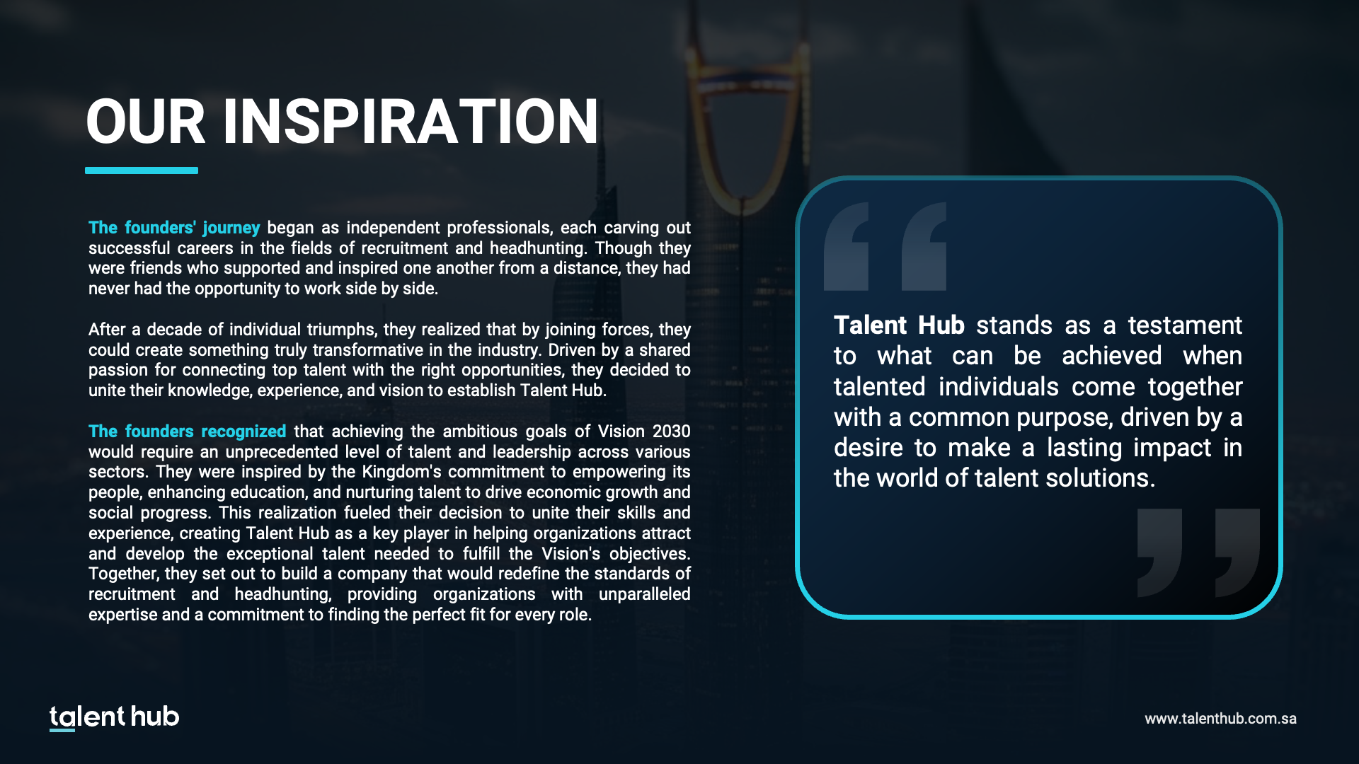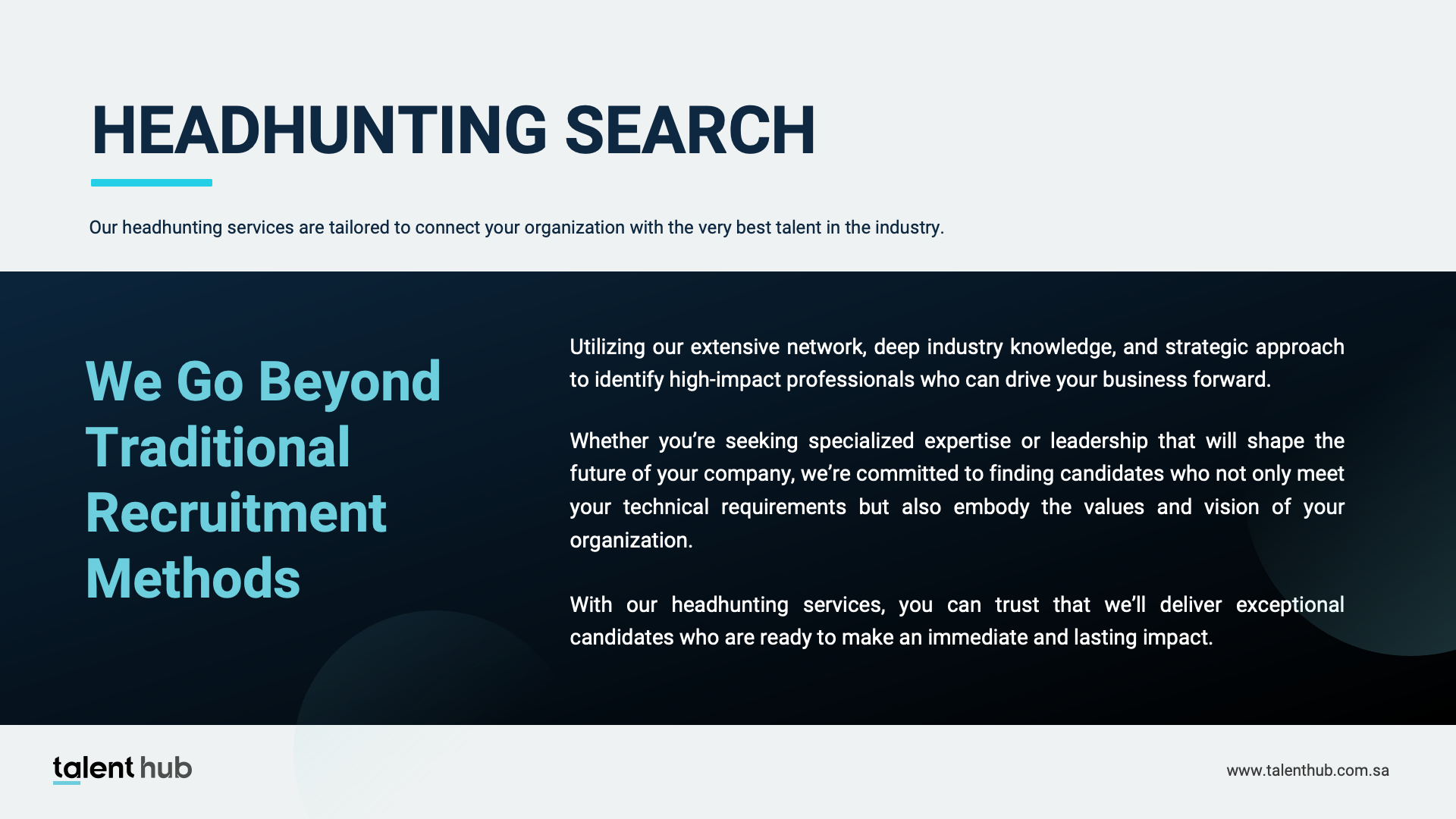 Talent Hub doesn’t just find talent , they build teams that shape the future. For their company profile, we designed a presentation that reflects their precision and passion. Clean, dynamic slides go through the executive search, headhunting, and employee assessment services while trying in some stories about how they've supported other companies in becoming successful. we turned their story into a tool that speaks to businesses looking for more than just a recruiter.