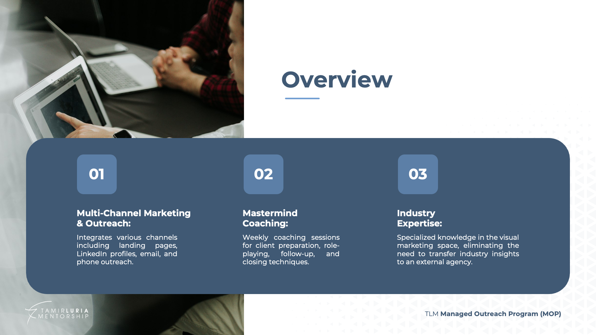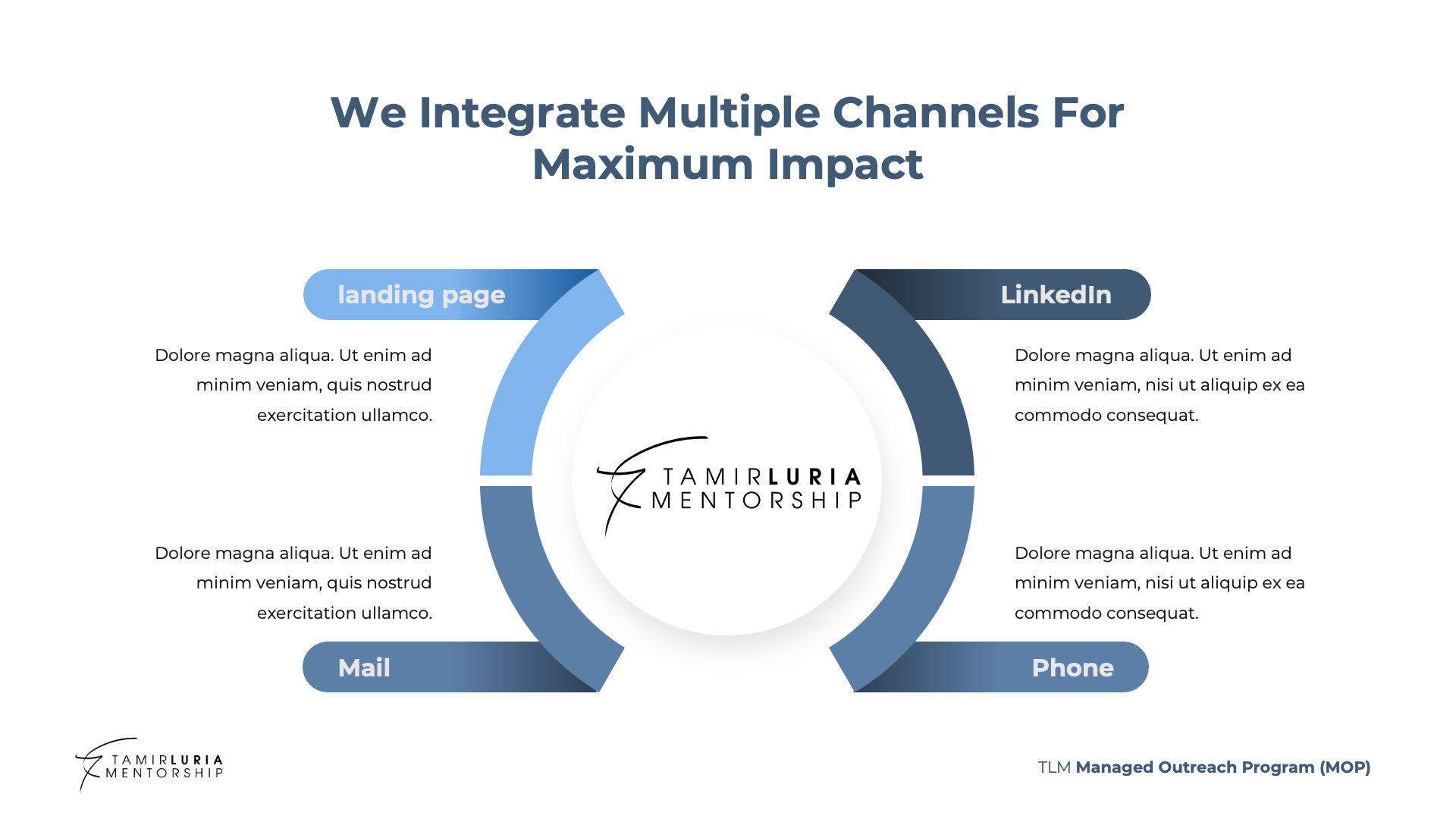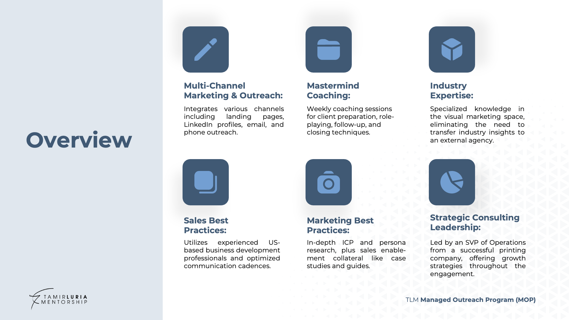 Sales shouldn’t feel like a guessing game. For TLM’s Managed Outreach Program, we crafted a presentation that turns their proven strategies into a clear roadmap for growth. From multi-channel outreach to expert coaching, every slide highlights how they help businesses connect with dream clients—without the headaches. Real-world examples and clean visuals make scaling sales feel achievable, not overwhelming.