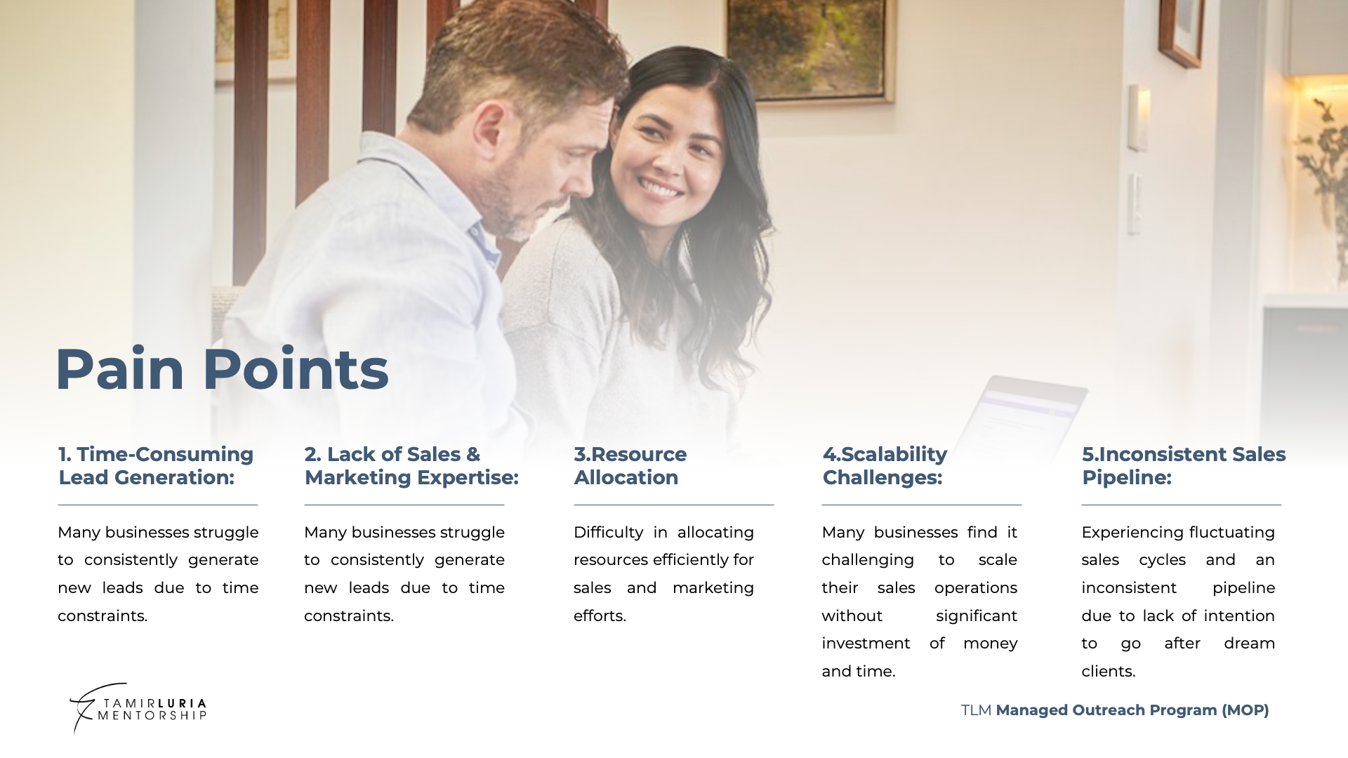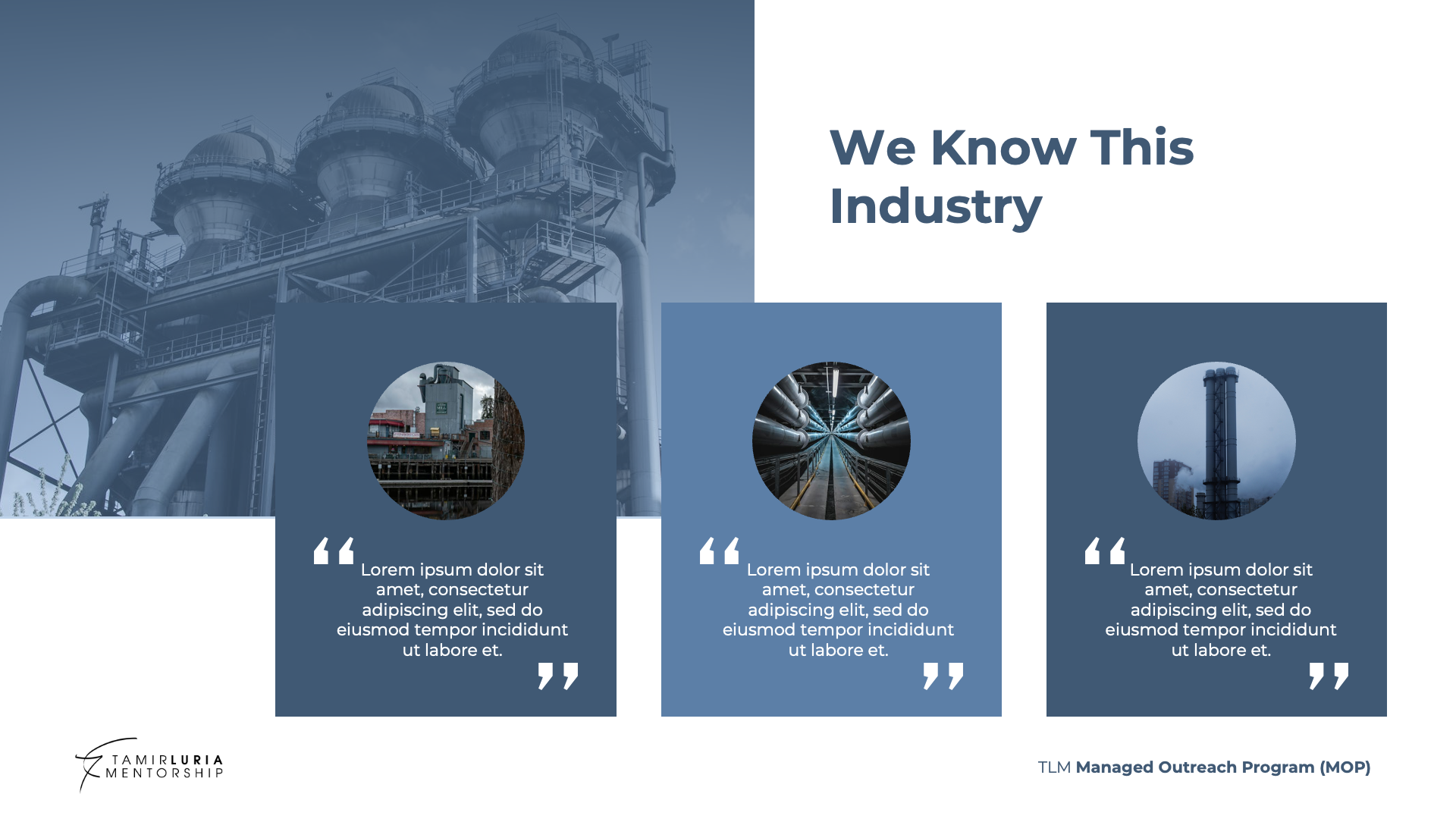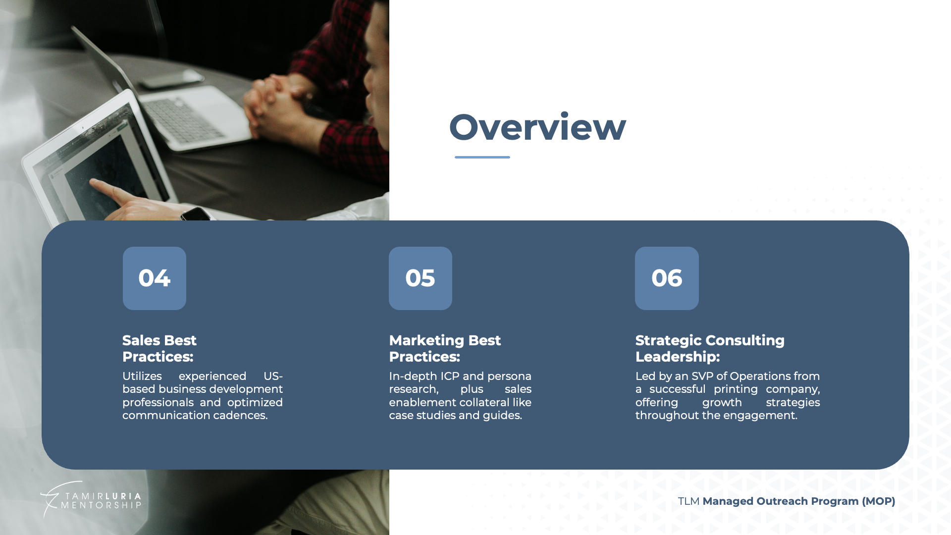Sales shouldn’t feel like a guessing game. For TLM’s Managed Outreach Program, we crafted a presentation that turns their proven strategies into a clear roadmap for growth. From multi-channel outreach to expert coaching, every slide highlights how they help businesses connect with dream clients—without the headaches. Real-world examples and clean visuals make scaling sales feel achievable, not overwhelming.